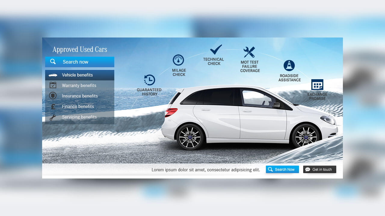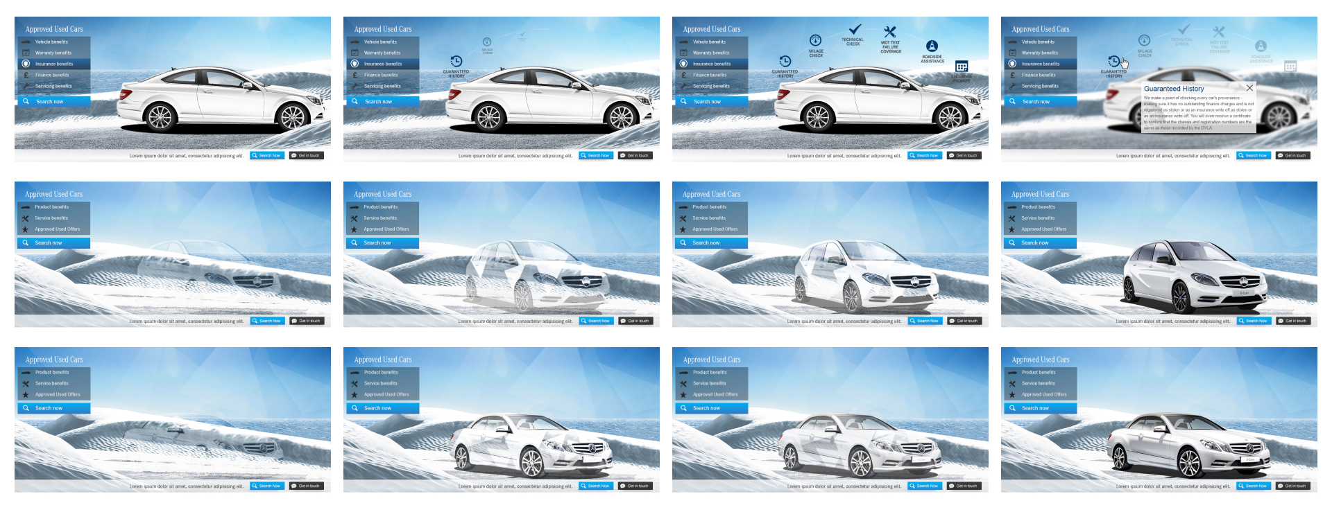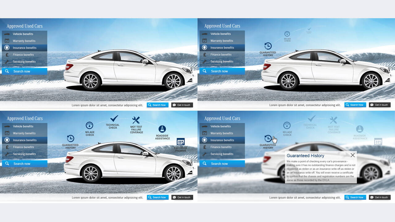 Designed and developed the Mercedes-Benz Approved Used Microsite, using interactive animations to create an engaging experience that highlighted the benefits and peace of mind of purchasing through the dealership.